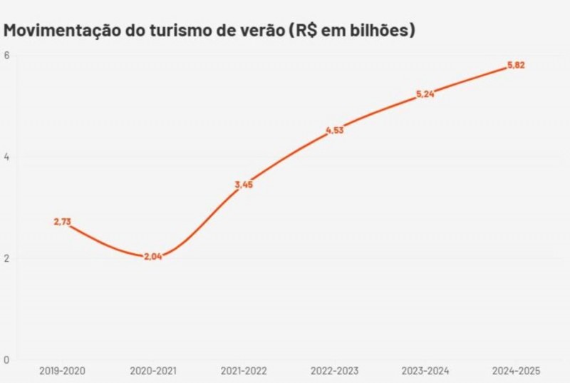 A evolução histórica mostra uma recuperação consistente a partir da temporada 2021/2022, quando a movimentação chegou a R$ 3,4 bilhões. Nas temporadas seguintes, o turismo de verão superou R$ 4,5 bilhões em 2022/2023 e ultrapassou R$ 5,2 bilhões em 2023/2024. O crescimento contínuo indica estabilidade do setor e maior capacidade de geração de renda ao longo dos últimos ciclos.